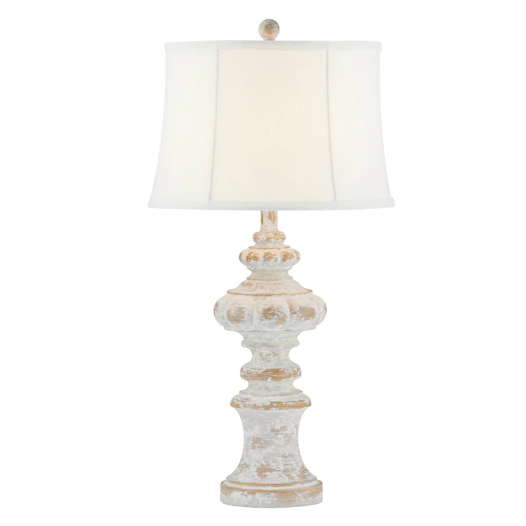 Mara Table Lamp - A table lamp that will fit into any setting. This table lamp features grey distressing and a whitewash throughout and topped with a tapered drum softback linen shade. Its stunning unique shaded base adds a touch of French antique inspiration to your space. Its neutral finish makes it easy to introduce into any space.