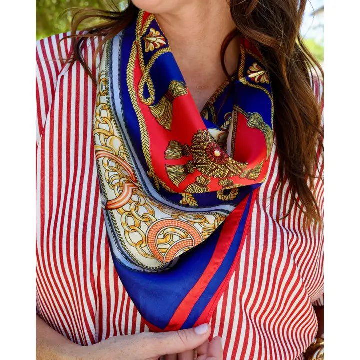 Elevate your ensemble with the Trellis Tassel Scarf in Red and Navy. Featuring a sophisticated blend of navy hues accented by a vibrant medallion print in red, cream, light blue, and gold, this scarf is detailed with elegant rope and tassel motifs. Its versatile design offers endless styling possibilities, making it a refined accessory for any wardrobe. Also a great piece for elevating your gameday style. Dimensions: * 28" Square * 70% Viscose, 30% Silk