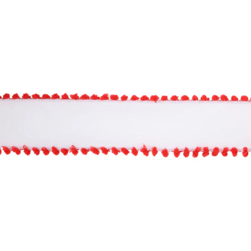 1 1/2" Wired Ribbon | White w/ Red Pom Pom Edge | 10 Yard Roll