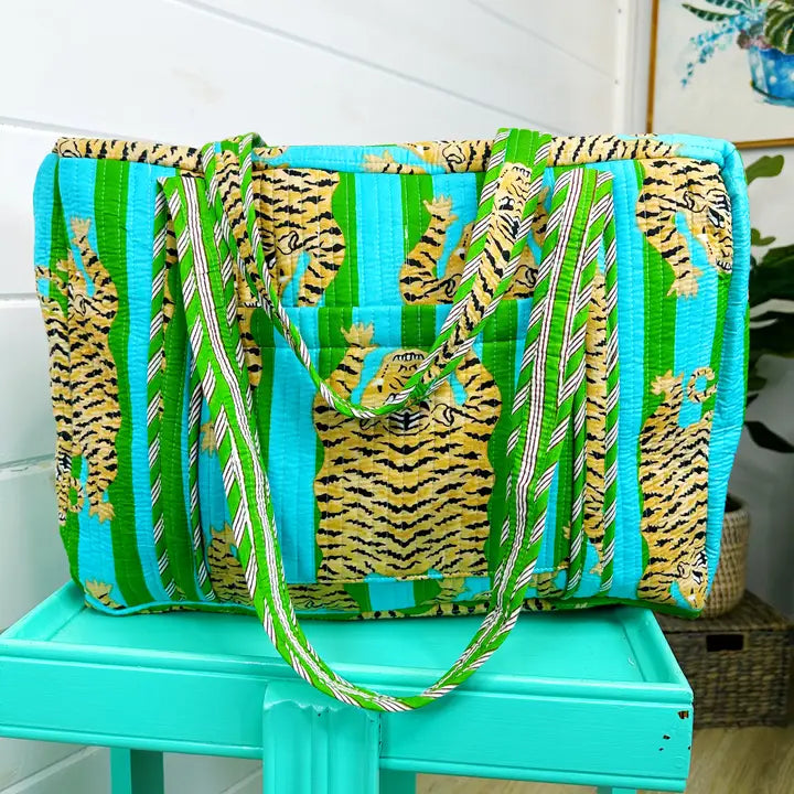 Quilted hand block print, contrasting trim and interior. Perfect for a overnight, weekender travel bag and more!
