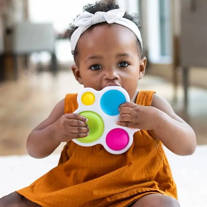 Little fingers can't resist these beautiful buttons! Built safely into the sturdy ABS plastic frame are five vibrant silicone bubbles in varying sizes and colors. It's so simple, yet oddly, so brilliantly fun, fascinating, and impossible to put down...for babies...or adults! Push them all the way in to pop them through to the other side. Delve into the simple delight of poking them with your fingers. It's a perfect sensory adventure babies and toddlers can take with them everywhere they go! (Not to mention, it's also a great decoy for staving off your grandma's cheek-grabbing fingers...) Inspire loads of giggles and hours of sensory exploration with the adorable, playful, and wonderfully durable Dimpl sensory toy.