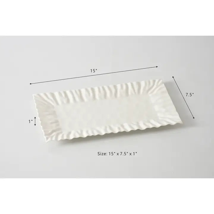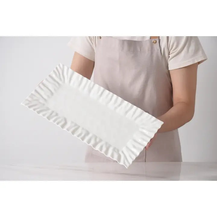 Rectangular Tray in Mascali Bianca. This rectangular all-purpose tray makes an easy transition from oven to table. Perfect for serving main courses and large sides! Versatile high-fired porcelain pieces that are microwave safe! Food safe, dishwasher safe, oven safe to 500°. Tarnish and stain-free. Easy Care.